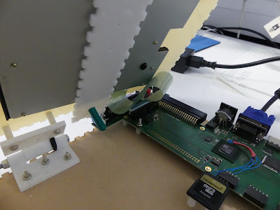 You can also see that I have screwed the C65 prototype motherboard down to another panel, and then added a home-made friction hinge (although it isn't strong enough to hold the keyboard open in position), so that I can open it up to get to the SD card. We might yet extend the SD card to a better location, so that we don't need to open the "lid" all the time.